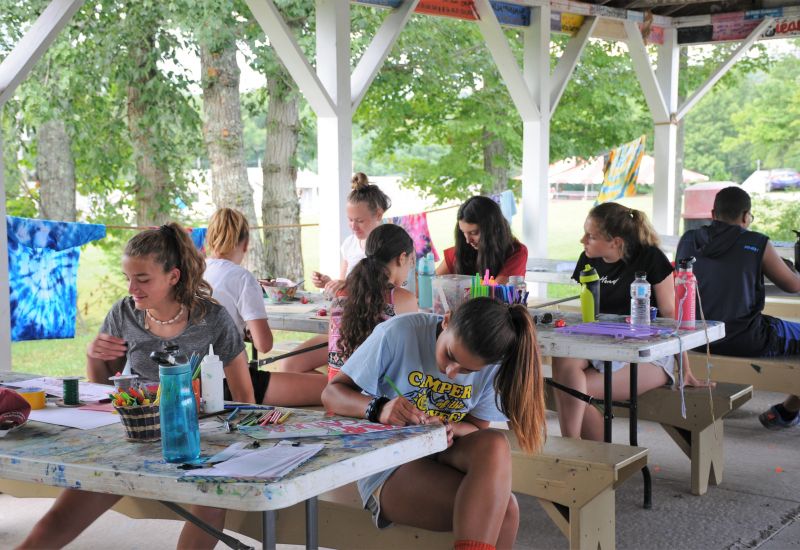 The Teen Campus Art Center was expanded in 2019 and now measures 105’ by 30’. It includes an open-air pavilion area, pottery room with 9 wheels, kiln room, and indoor project rooms. The Creative Arts Pavilion on Junior Campus measures 150’ by 50’. It includes a large open-air project area, pottery room with 15 wheels, ceramics studio, and a room for t-shirt creations. With over 7500 square feet of space, there’s plenty of space for campers to be creative and display their projects!