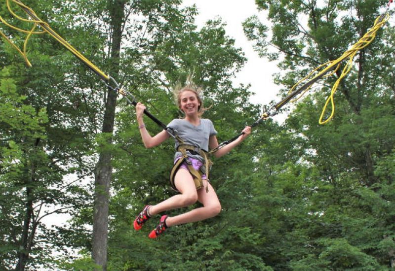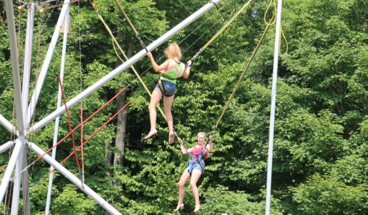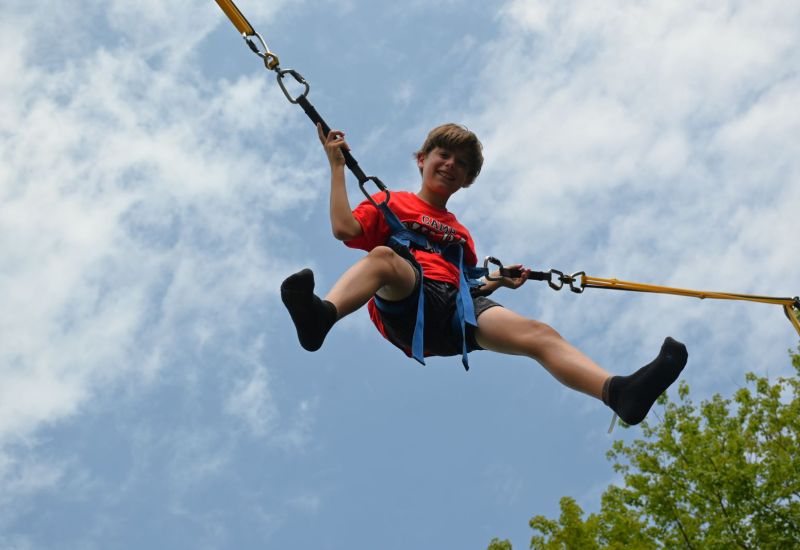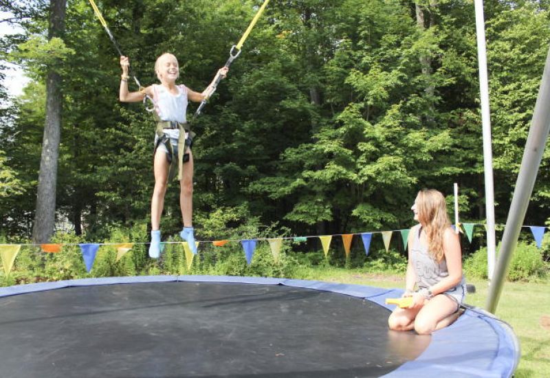 Jump into the action and bounce your way to fun at one of Cayuga’s wildest activities - EXTREME SPORT JUMPING. It takes place on our bungee trampoline, which is a large rig that combines a trampoline system with a bungee cord system. The rig features 4 separate trampolines, so 4 campers can participate at one time. It also features a patented bungee cord system that includes a hydraulic lift that automatically readjusts the height settings on the rig as you jump higher and higher. With this safety feature, you can’t over-stretch the bungee cord while jumping. There’s no other system like it. The bungee cord can propel you up to 24 feet in the air!