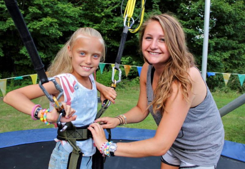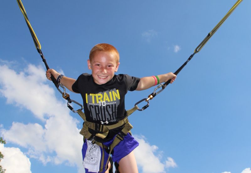 Jump into the action and bounce your way to fun at one of Cayuga’s wildest activities - EXTREME SPORT JUMPING. It takes place on our bungee trampoline, which is a large rig that combines a trampoline system with a bungee cord system. The rig features 4 separate trampolines, so 4 campers can participate at one time. It also features a patented bungee cord system that includes a hydraulic lift that automatically readjusts the height settings on the rig as you jump higher and higher. With this safety feature, you can’t over-stretch the bungee cord while jumping. There’s no other system like it. The bungee cord can propel you up to 24 feet in the air!